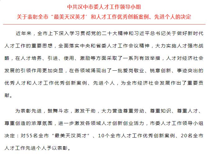 此次評(píng)選根據(jù)《中共漢中市委組織部關(guān)于開(kāi)展全市“最美天漢英才”和人才工作優(yōu)秀創(chuàng)新案例、先進(jìn)個(gè)人評(píng)選工作的通知》精神,經(jīng)逐級(jí)遴選和嚴(yán)格審核把關(guān)。