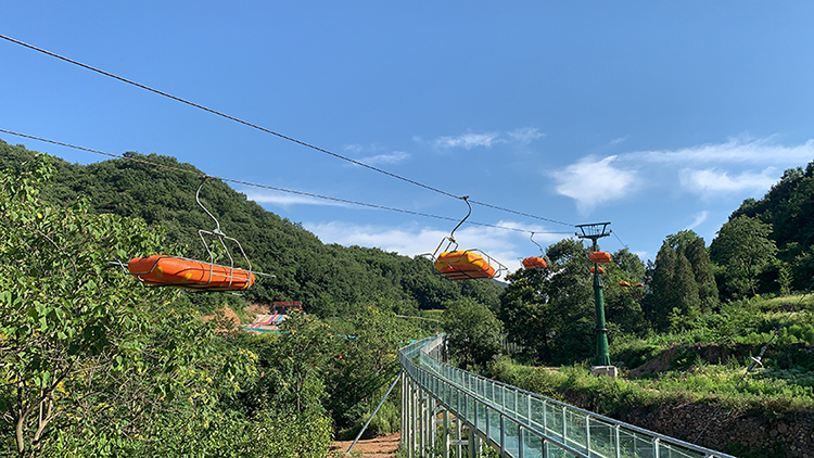 固定抱索器拖船索道主要用于漂流水滑,索道整體分布為驅動站、迂回站和線路部分,漂流船吊籃通過固定抱索器與鋼絲繩固定在一起。驅動站是為索道提供動力的部位,經迂回站的迂回輪導向后,把裝載有漂流船的運輸吊籃返回至上游的驅動站,達到運輸漂流船的目的,利用索道方式運輸漂流船的效率高。索道造價低,維護成本低,配置工作人員少,節約運輸成本。
